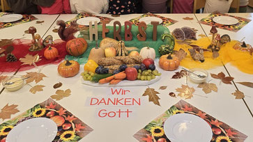 Im Oktober feierten unsere Kindergarten- und Hortgruppen das Erntedankfest. Dieses Fest vermittelt den Kindern Dankbarkeit für die Gaben der Natur und zeigt ihnen, woher Lebensmittel kommen und wie wichtig es ist, die Natur zu schützen und wertzuschätzen. Wir danken Gott für seine Gaben und feiern eine gute Ernte.