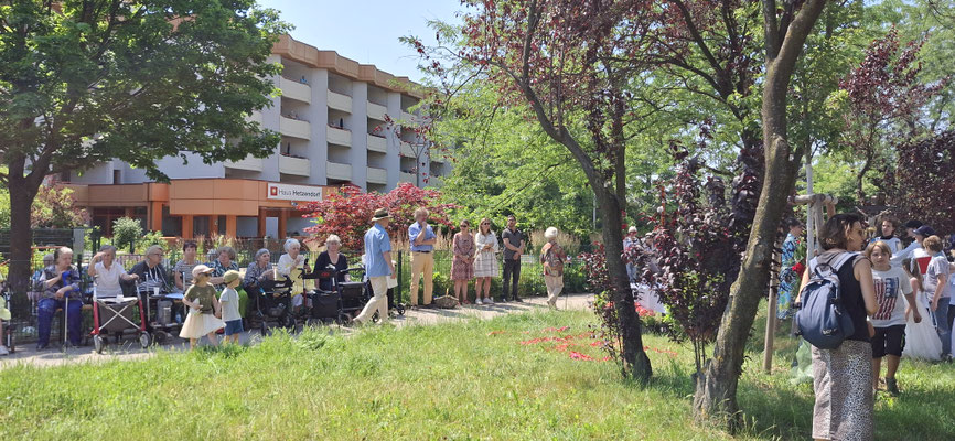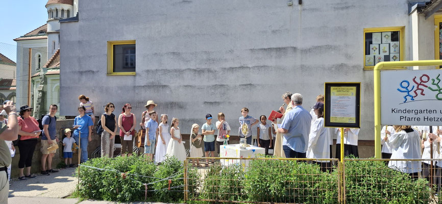 Dann läuft alles sehr geordnet und würdig ab. In seiner Predigt ermuntert Pfarrer Karol die Gemeinde an die Stationen und Abschnittte ihres Lebens zu denken. Später trägt er dann mitten in der gemeinsamen Prozession die Monstranz durch Hetzendorf. Mit ein paar Liedern macht die Pfarrgemeinde in den Straßen auf sich aufmerksam und kommt dabei auch am neu benannten Franz Hübel Park vorbei. Die Fronleichnamsprozession endet schließlich am Pfarrplatz bei Eis, Würstel und Bier. CKraus